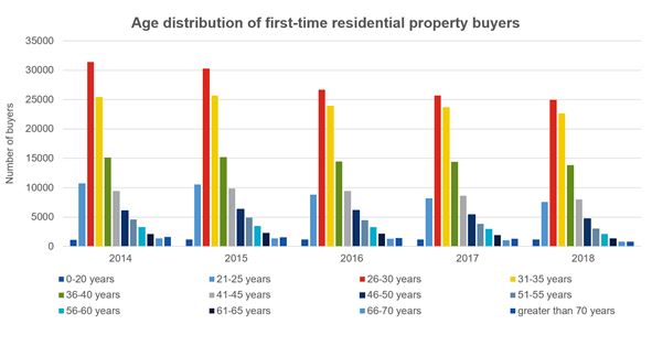 Even though their numbers do not differ much from year to year the trend evident in the graph below, for the years 2014-2018, suggests there is a delay in acquiring property as shown by the gradual decrease from 31% to 26% in the “26-30 years” band, most of which goes into the “31-35 years” band in the 5-year period.